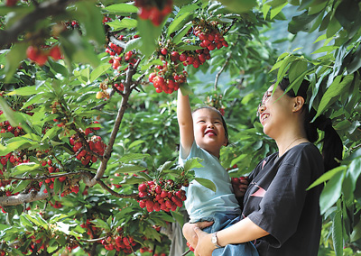 在河北石家庄的采摘园里,游客采摘樱桃。