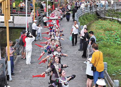 在湖南怀化的景区里,游客观看民族服饰表演。