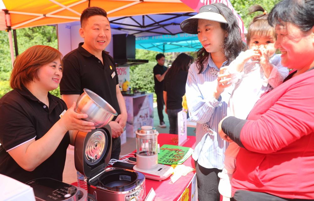 5月24日,在河北省秦皇岛市海港区白塔岭街道半岛书香社区开展的消费品以旧换新进社区活动中,商家为居民介绍家电产品及家电以旧换新补贴政策。曹建雄 摄
