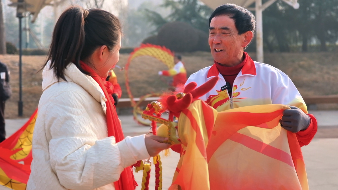 这个是8米的,今天专门给你准备的。过去舞龙都是壮劳力、小伙子舞,像我们这些年龄比较大的,还有些女同志,力气跟不上,后来就演变成这个绸子做的龙,男女老少都能舞。龙年到了,我们这些老年人、老伙伴,就想排一个舞龙的节目,舞出咱们的精气神!