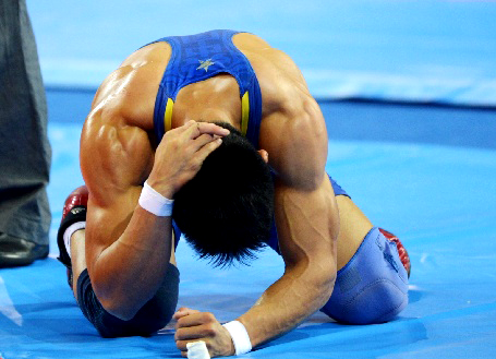 还记得四年前2013年9月6日, 辽宁第十二届全运会国际式摔跤男子古典式摔跤 75公斤级决赛之战,杨斌在与辽宁队选手田海龙的比赛中,手指不幸骨折,呈现了90度弯曲,但是坚强的他带伤打完了比赛,获得了一枚银牌,这也成为了杨斌职业生涯的一大遗憾。这四年,他刻苦训练,一直在努力,为的就是这个冠军,这一次,他做到了。比赛结束后,杨斌跪在了摔跤场的中心,亲吻了摔跤台,他用这个冠军,回报了教练,回报了家人,更回报了他自己。