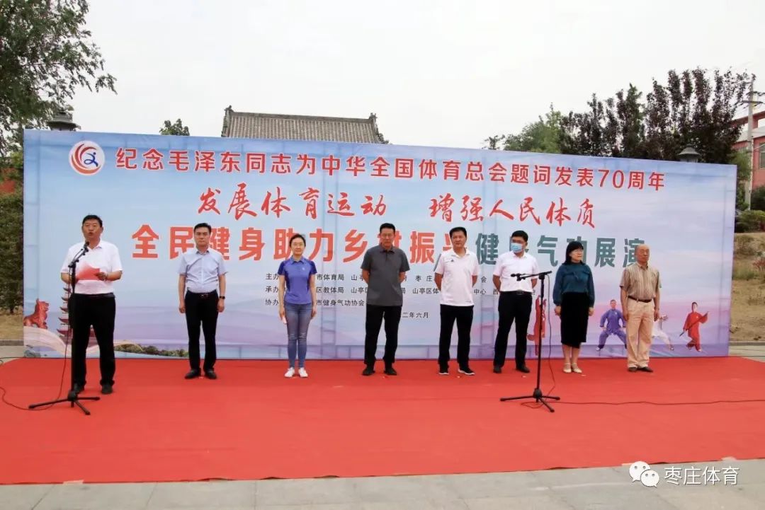 6月4日,枣庄市全民健身助力乡村振兴健身气功展演活动在山亭区西集镇文化健身广场举行。本次活动由枣庄市体育局、山亭区人民政府、枣庄市体育总会主办,山亭区教体局、区农业农村局、区体育事业发展中心、西集镇政府承办,枣庄市健身气功协会协办。枣庄市体育局党组成员、市竞技体育事业发展中心主任、市体育总会秘书处秘书长范卫东,山亭区政府副区长戴娟,枣庄市竞技体育事业发展中心副主任、市体育总会秘书处副秘书长蔡旭,枣庄市健身气功协会主席房斌以及市、区、镇有关部门领导出席活动。