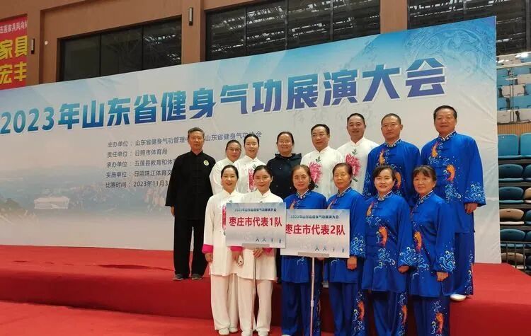 我市代表队参加了四个集体项目的比赛,台儿庄工人文化宫健身队作为枣庄市代表一队获得太极养生杖一等奖、导引养生功十二法二等奖;凤翎健身队作为枣庄市代表二队获得五禽戏和六字诀2个三等奖。