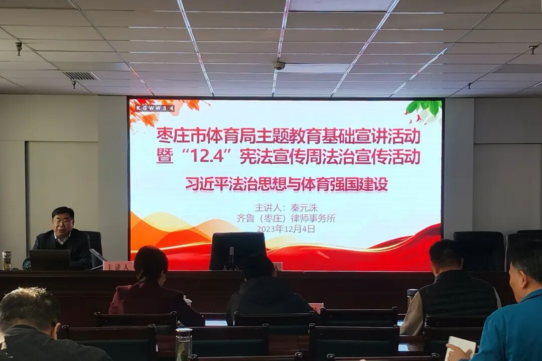 12月4日是国家宪法日,市体育局邀请齐鲁(枣庄)律师事务所主任秦元洙,举办了《习近平法治思想与体育强国建设》宣讲暨宪法宣传日宣教活动。