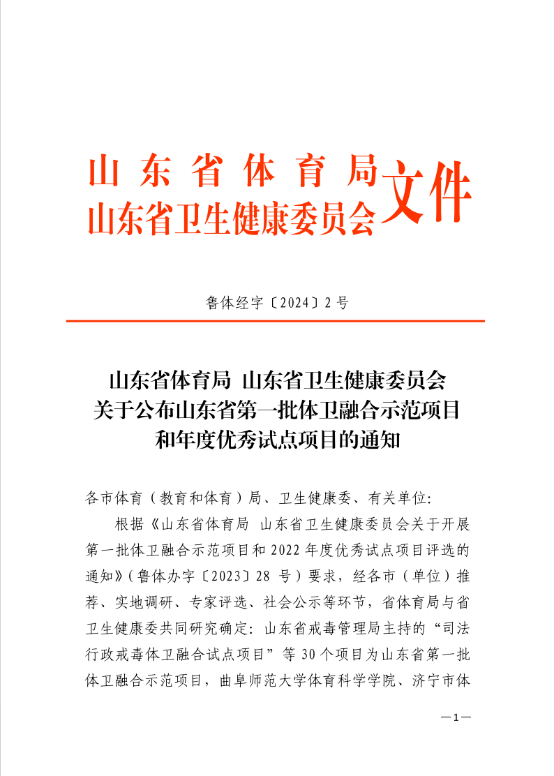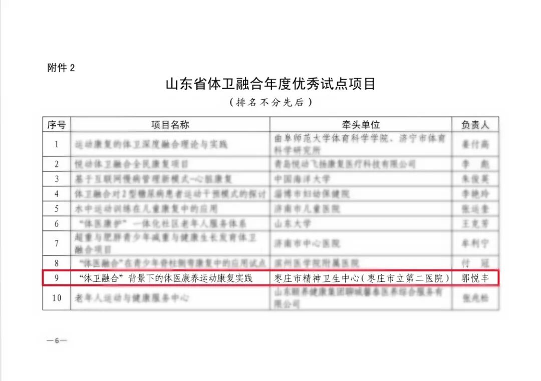 根据《山东省体育局 山东省卫生健康委员会关于开展第一批体卫融合示范项目和2022年度优秀试点项目评选的通知》(鲁体办字〔2023〕28 号)要求,经各市(单位)推荐、实地调研、专家评选、社会公示等环节,省体育局与省卫生健康委共同研究,山东省第一批体卫融合示范项目和山东省体卫融合年度优秀试点项目评选结果揭晓,枣庄市立二院牵头申报的两个项目均入选!