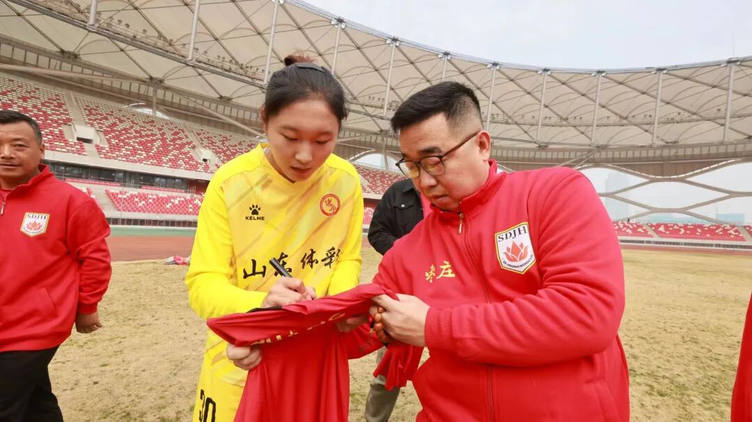 会上,山东体彩女足领队纪广崴介绍了山东女足基本情况。山东体彩女足以年轻球员为主,平均年龄22岁,2023赛季女超联赛获得第六名,在刚刚2024全国女足锦标赛获得第六名。山东体彩女足4名球员展示了新赛季比赛服。其中,守门员刘晨年仅17岁,是U20国家队主力门将,2022年金童奖得主,参加过2022年世少赛,2024年亚青赛 ;守门员郭霓烜曾代表历城二中获得世界中学生锦标赛冠军;主力后卫何璐瑶曾入选国青,代表U20参加过世青赛;边后卫孙芳芮为第十四届全运会第四名主力队员。球迷见面会后,山东体彩女足4名球员来到足球场进行训练,并与球迷们亲切互动,进行签名合影。