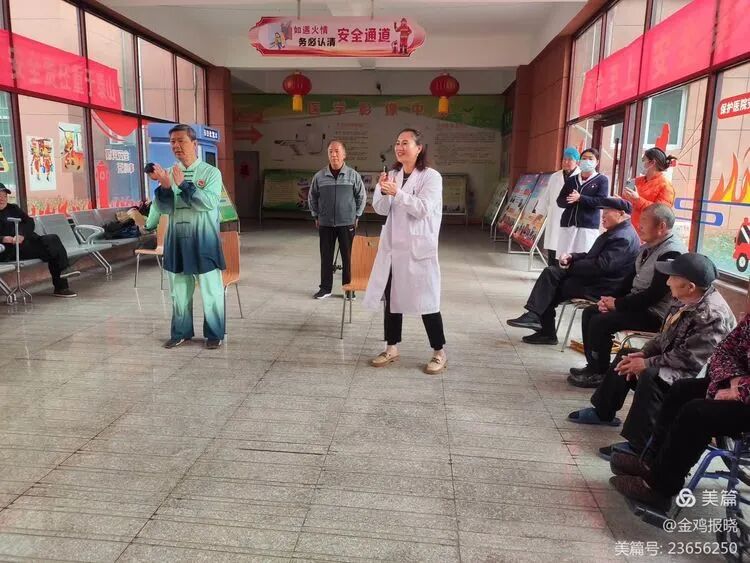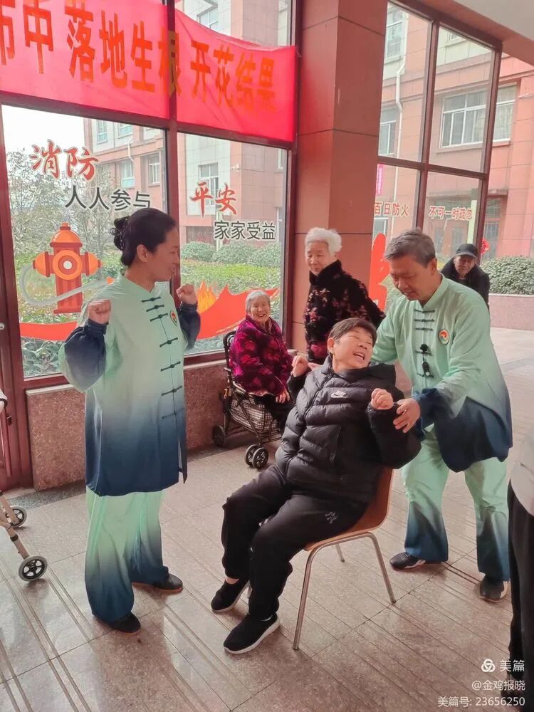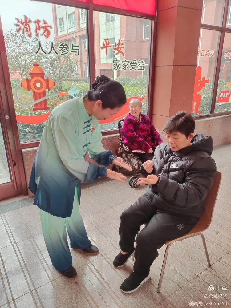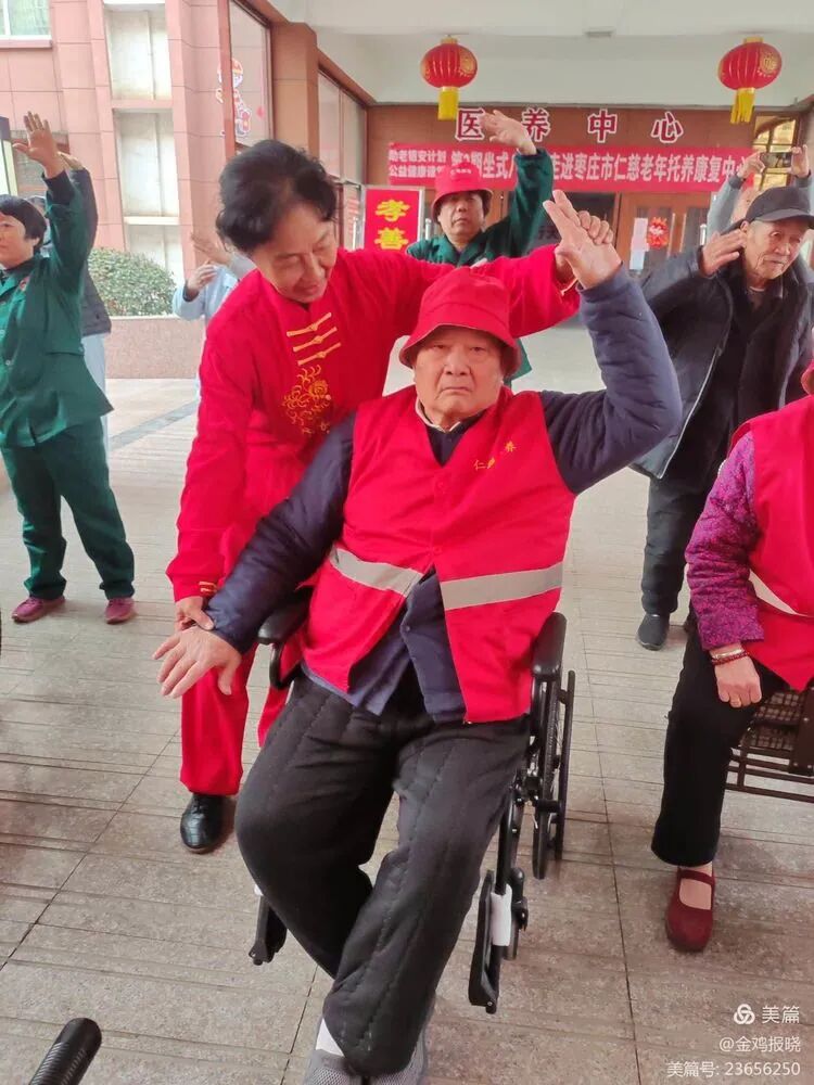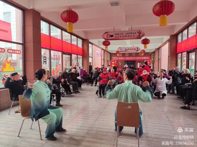 枣庄市健身气功协会志愿者许国跃(国家级社会体育指导员)、吴鹏程(一级社会体育指导员)、王亚鲁(一级社会体育指导员)、冯永梅(一级社会体育指导员)向40余位入住康养老人进行了坐式八段锦教学。