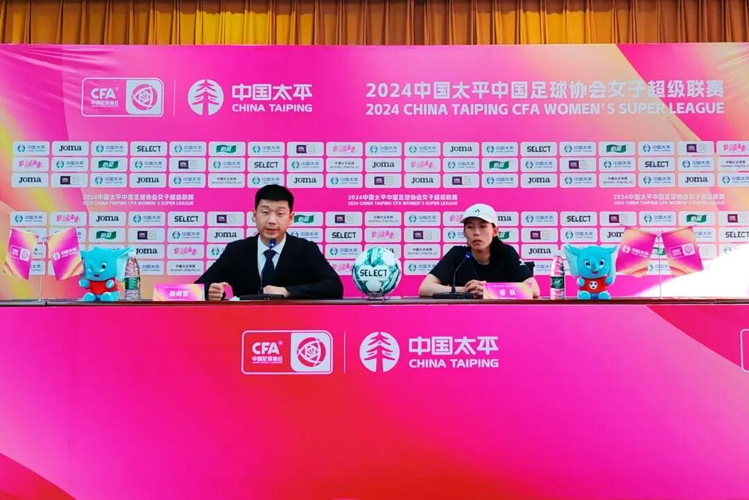 赛后新闻发布会环节,江苏无锡女足主教练陈婉婷,山东体彩女足主教练崔勇出席并接受记者提问。