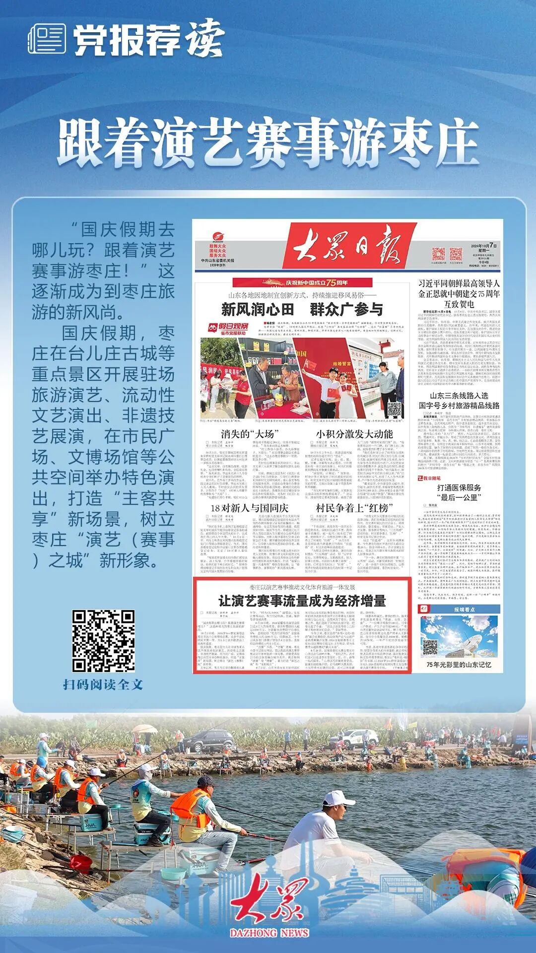 【编者按】10月7日,《大众日报》头条刊发《枣庄以演艺赛事推动文化体育旅游一体发展 让演艺赛事流量成为经济增量》,详细介绍了我市以高品质演艺赛事推动文化体育旅游一体发展,培塑更具吸引力的文体旅融合城市名片,推动“量”变“增量”的探索实践。