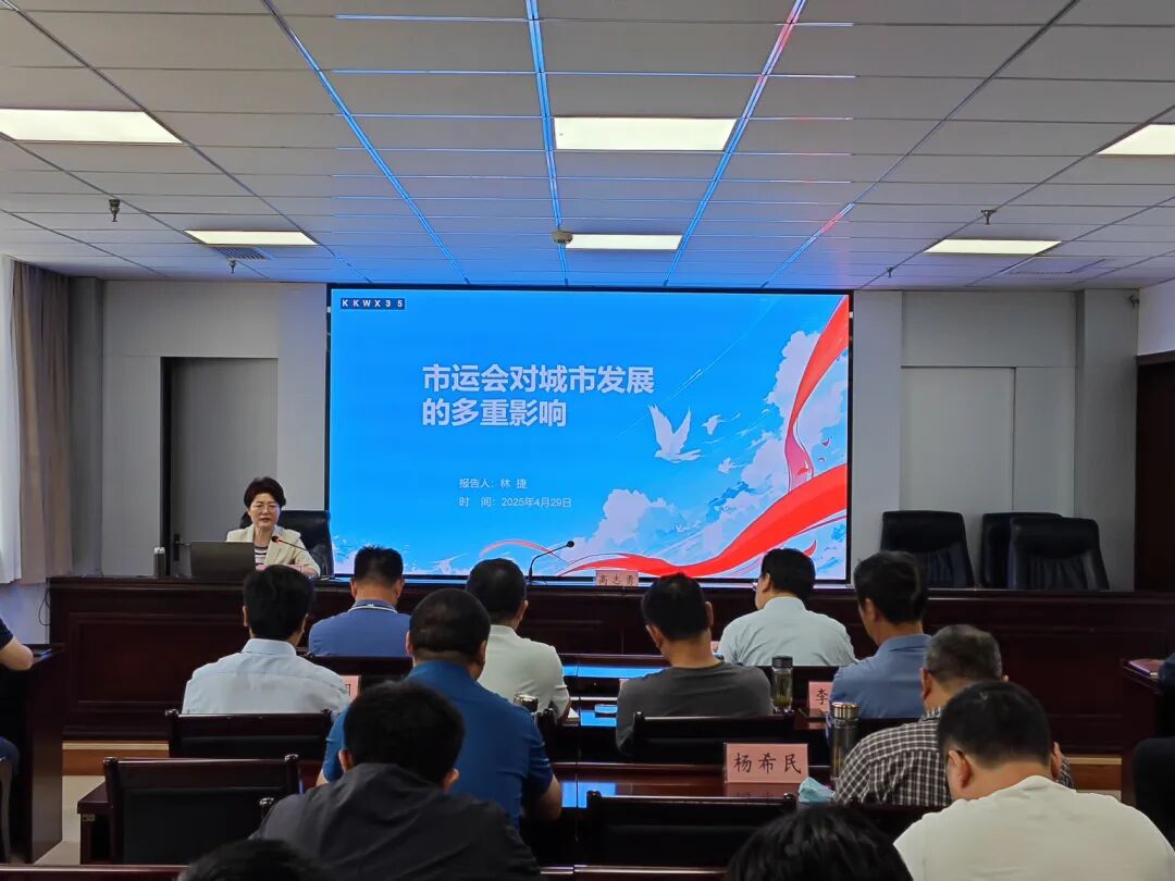 为深化干部专业化能力建设,助力枣庄市第十一届运动会(以下简称“十一运会”)高质量筹备,4月29日,枣庄市体育局举办业务知识大讲堂暨“干部上讲台”活动。市体育局局长林捷以《市运会对城市发展的多重影响》为题作专题授课,党组书记高志勇主持活动,全局干部职工参加学习。