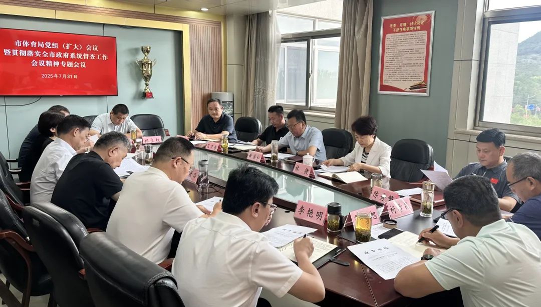 7月31日,市体育局召开党组扩大会议,学习传达全市政府系统督查工作会议精神,研究部署下步工作措施。市体育局党组书记黄浩仁同志主持会议并讲话,局长林捷传达会议精神。局在家县级领导干部、各科室(单位)负责同志参加会议。