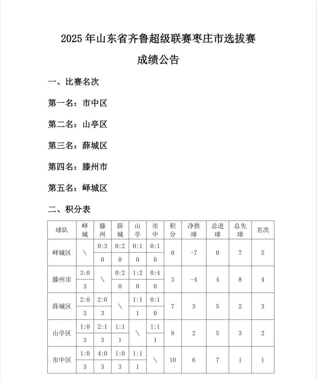 近日,2025年山东省齐鲁足球超级联赛枣庄市选拔赛圆满结束。来自全市的五支队伍参赛,最终市中区夺冠、山亭区亚军、薛城区季军。