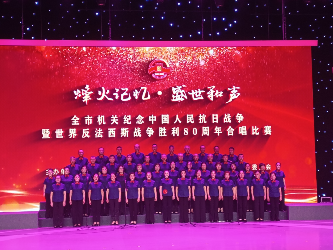 8月6日,“烽火记忆 盛世和声”市直机关纪念中国人民抗日战争暨世界反法西斯战争胜利80周年合唱比赛在枣庄市新闻传媒中心举办。由市老年体协《百姓大舞台》合唱团为主体组队参赛的市体育局代表队深情演绎的经典曲目《保卫黄河》,以铿锵之声致敬峥嵘岁月,以赤子之心礼赞信仰力量,澎湃黄河音,激荡报国情,赢得满堂喝彩,获得三等奖。