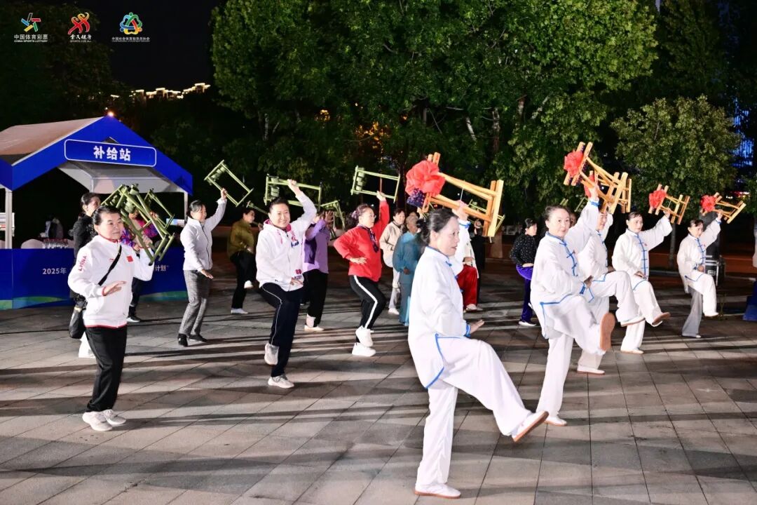 10月14日晚,2025年“万村女性社会体育指导员培训计划”交流展示大会配套活动之一的“小马扎 大健康”传统科学健身活动在枣庄文体中心体育馆馆前广场精彩上演。这项独具特色的传统健身活动吸引了来自全国各省代表队、健身爱好者及当地居民群众300余人积极参与。
