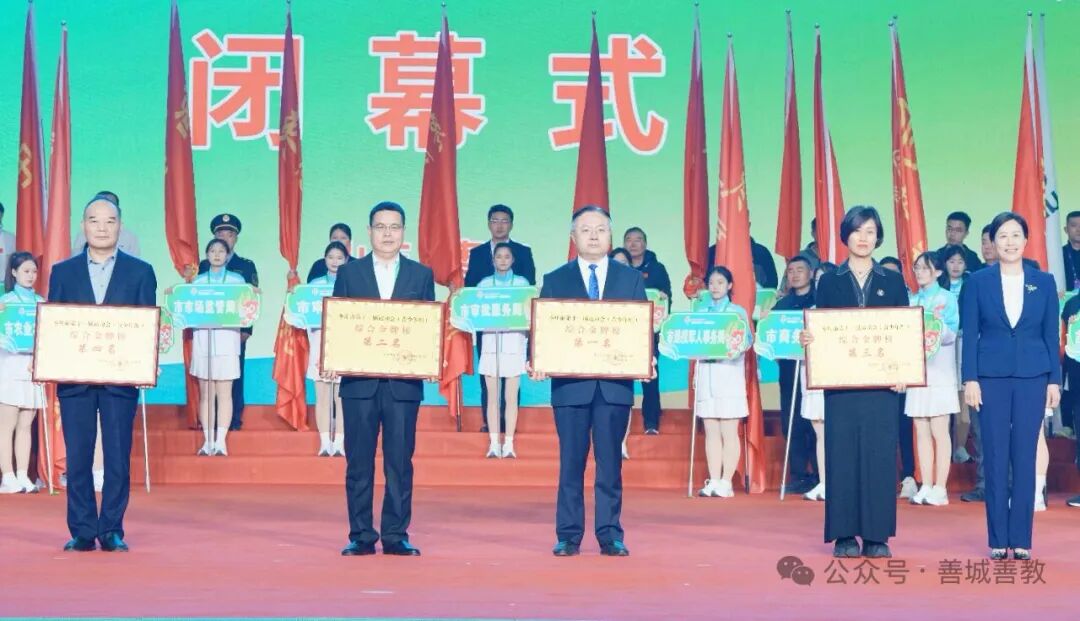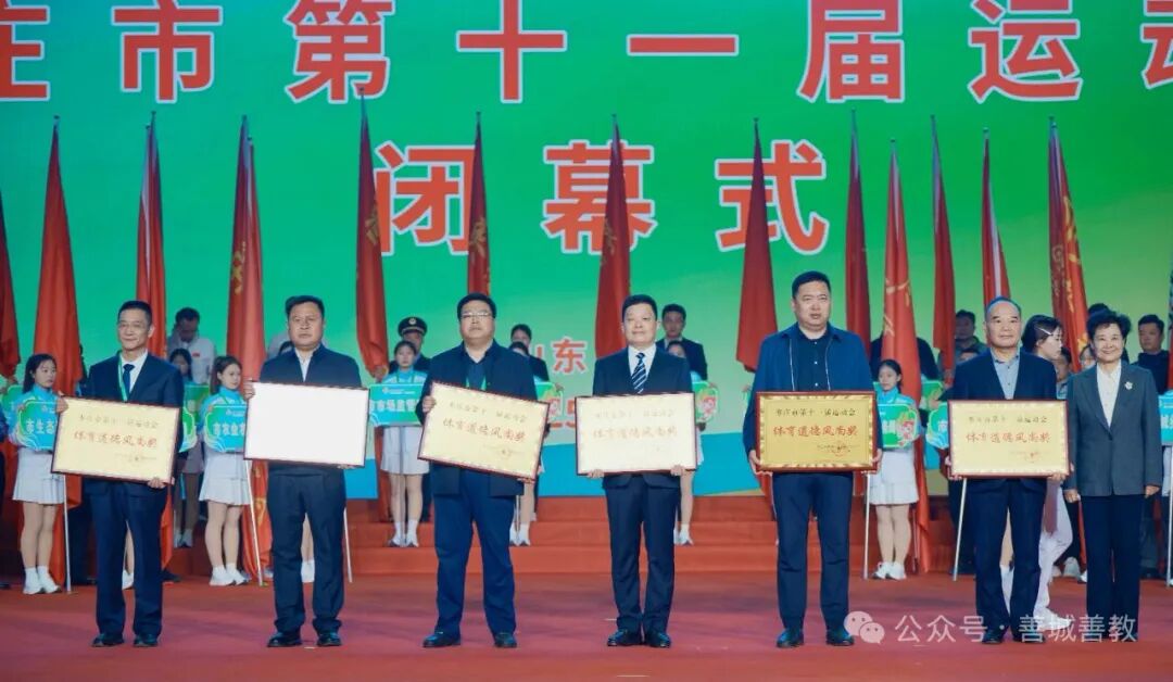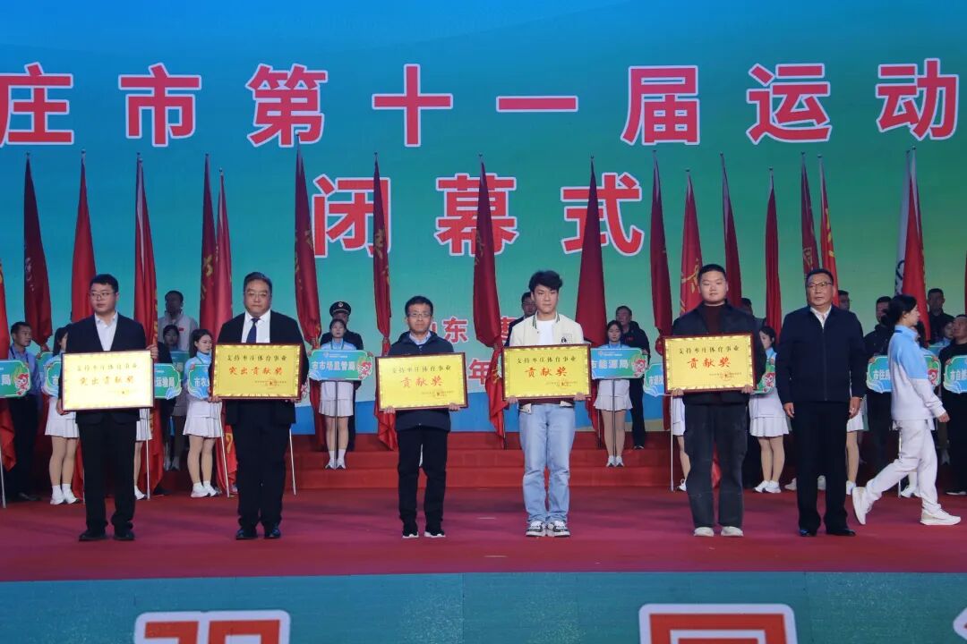 本届市运会恰逢“十四五”收官、“十五五”开局关键节点,既是对枣庄体育事业发展成果的全面检阅,更是对 “拼搏奋斗、敢为人先”城市精神风貌的生动展现。本届盛会坚持竞技体育与群众体育并重、人才选拔与全民健身结合,一方面设置19个竞技体育项目,成功选拔一批优秀竞技体育人才,巩固体育人才梯队建设;另一方面开设22个群众体育项目,同步举办市第十五届全民健身运动会23项赛事,覆盖不同年龄段、不同运动爱好群体,让体育真正成为惠及全民的民生福祉。闭幕式上,赛事组委会对相关参赛获奖代表团进行了现场颁奖。其中滕州市获得市十一运(青少年组)比赛金牌榜、比赛总分榜、综合金牌榜、综合总分榜等多个第一名。组委会还颁发了市十一运会体育道德风尚奖、群体组优秀组织奖、开幕式大型团体操优秀节目奖、支持枣庄体育事业突出贡献奖,以及第十五届全民健身运动会突出贡献奖、优秀组织奖。