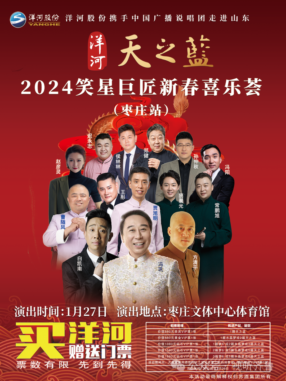 2024,新年伊始,为了回馈枣庄人民对洋河蓝色经典的厚爱,洋河股份携手中国广播说唱团,特邀冯巩等笑星巨匠走进枣庄,举办本次以相声为主题的新年喜乐荟。为枣庄消费者献上一场喜乐盛宴,给枣庄人民拜个早年!