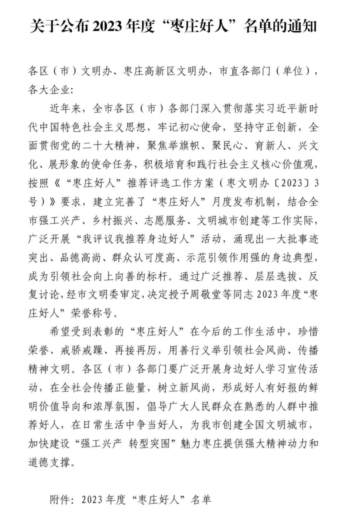 2月6日,枣庄市精神文明建设委员会办公室印发了《关于公布2023年度“枣庄好人”名单的通知》。其中,市体校教练员郭泰获得2023 年度“枣庄好人”荣誉称号!