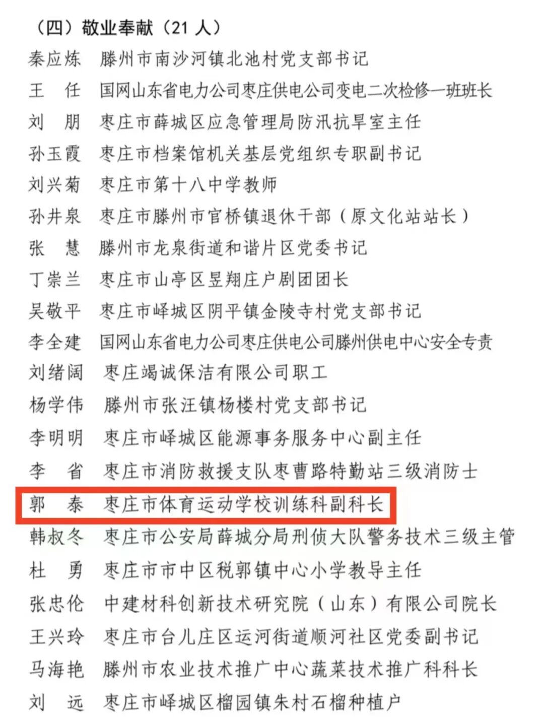 榜上有名!市体校教练员郭泰获得2023 年度“枣庄好人”荣誉称号
