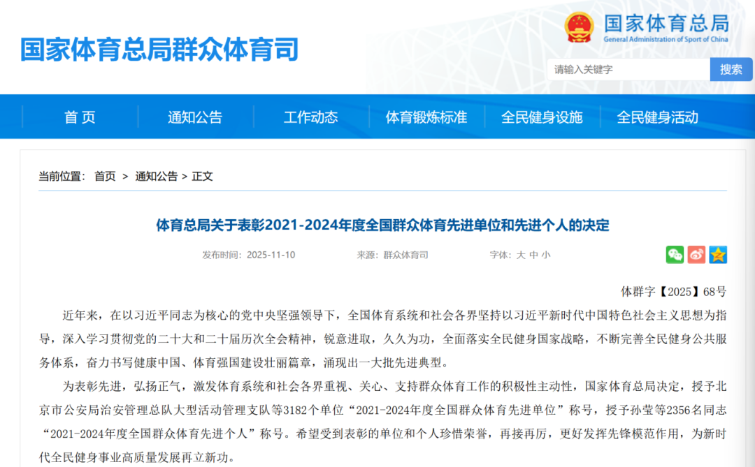 授予3182个单位“全国群众体育先进单位”称号和2356人“全国群众体育先进个人”称号